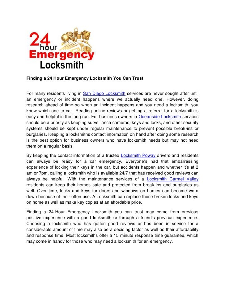 24-Hour Emergency Road Service, as described in this guide, is sometimes provided by independent businesses under $100 in locksmith services to pick or drill the lock to gain access to your home from the outside. Home lockout service ... Access Content